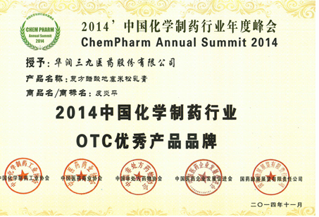 中國化學制藥行業(yè)年度峰會由中國化學制藥工業(yè)協(xié)會、中國醫(yī)藥商業(yè)協(xié)會、中國非處方藥物協(xié)會、中國醫(yī)藥企業(yè)發(fā)展促進會、國藥勵展展覽有限責任公司共同主辦,峰會發(fā)布了“2014中國化學制藥行業(yè)優(yōu)秀企業(yè)和優(yōu)秀產(chǎn)品品牌”。華潤三九皮炎平與輝瑞的鈣爾奇、中美天津史克的芬必得、西安楊森的達克寧等多個產(chǎn)品品牌一起獲得該項榮譽?! 。ㄍ跖d旺)