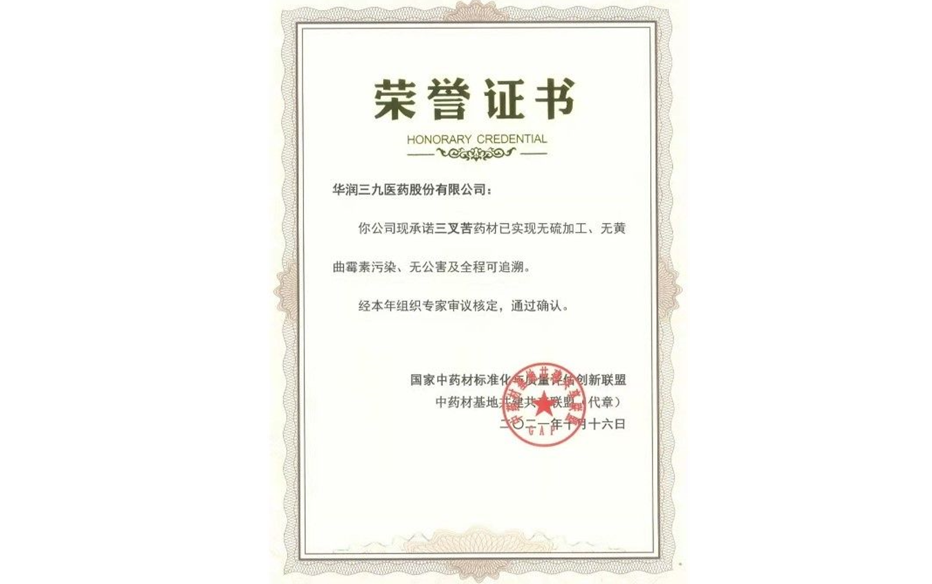 10月16日,在南寧召開的第九屆中藥材基地共建共享聯(lián)盟交流大會上,華潤三九申報的“三叉苦”藥材獲評“三無一全”優(yōu)質(zhì)藥材,并頒授品牌品種證書。“三無一全”證書由國家中藥材標(biāo)準(zhǔn)化與質(zhì)量評估創(chuàng)新聯(lián)盟頒發(fā),要求在中藥材生產(chǎn)過程中實(shí)現(xiàn)無硫加工、無黃曲霉素污染、無公害及全程可追溯。