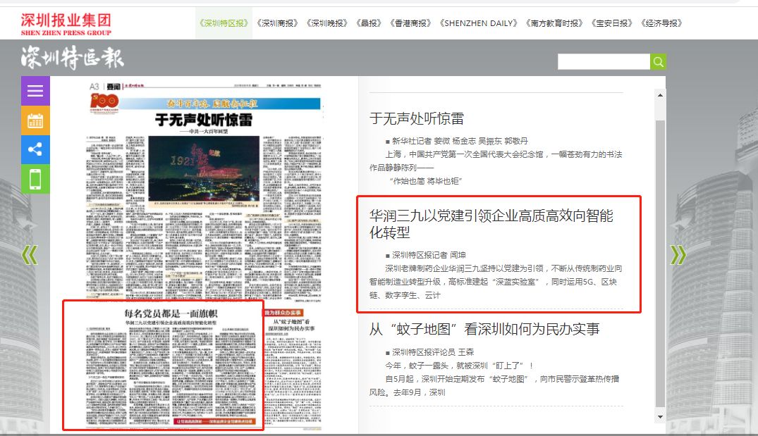 編者按:近期,深圳特區(qū)報(bào)記者對(duì)邱華偉書記進(jìn)行了專題采訪。6月16日,《深圳特區(qū)報(bào)》刊發(fā)了標(biāo)題為“每名黨員都是一面旗幟,華潤(rùn)三九以黨建引領(lǐng)企業(yè)高質(zhì)高效向智能化轉(zhuǎn)型”的專題訪談文章,重點(diǎn)報(bào)道了公司黨建與業(yè)務(wù)深度融合的做法和亮點(diǎn)。
