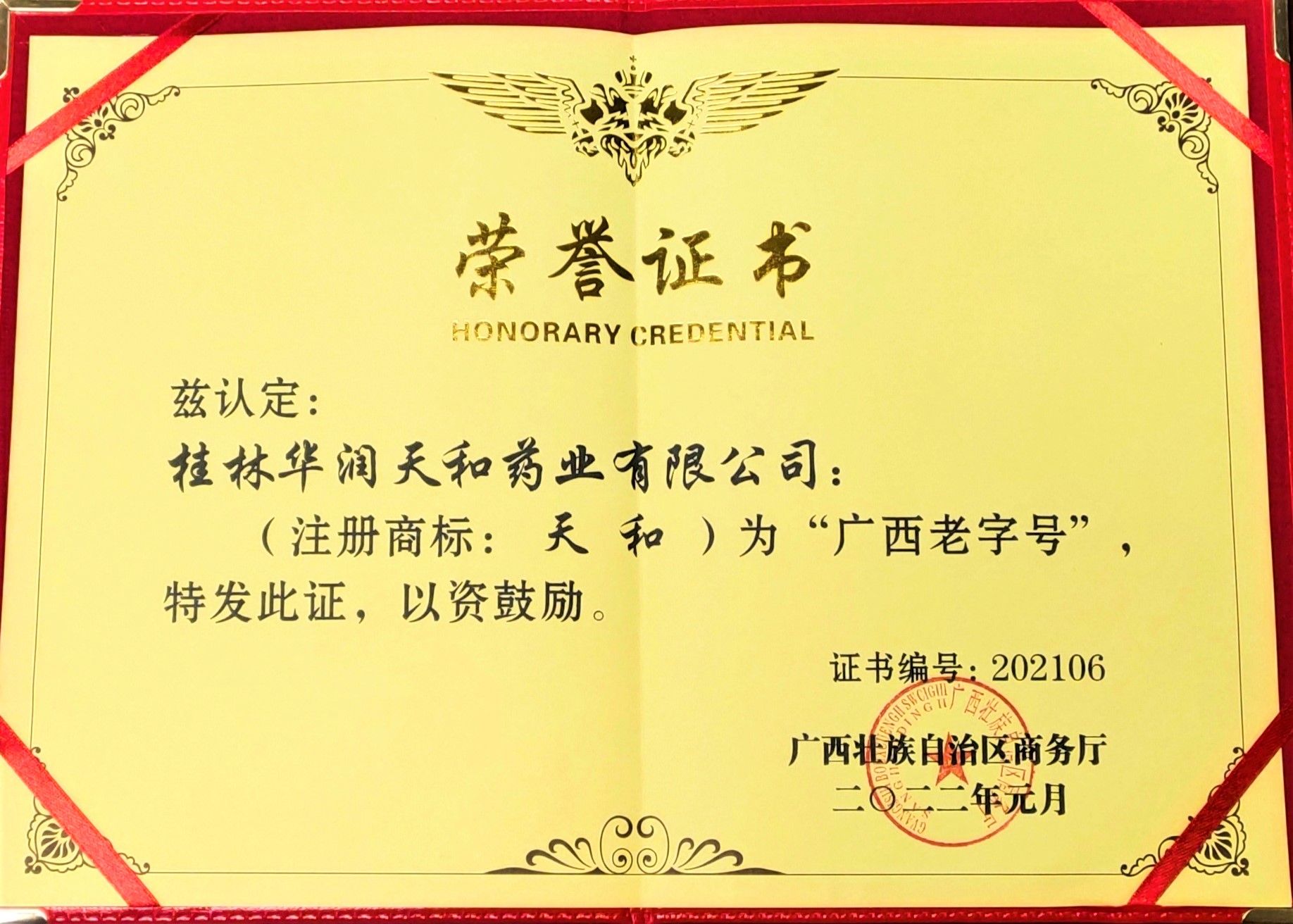 4月15日,廣西壯族自治區(qū)商務(wù)廳召開2022年全區(qū)老字號(hào)工作推進(jìn)會(huì)議,會(huì)上為2021年入選“廣西老字號(hào)”的13家企業(yè)頒發(fā)了榮譽(yù)證書和牌匾,華潤天和喜獲這一榮譽(yù)。