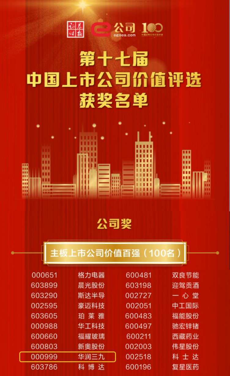 了解更多>>>華潤三九獲評第十七屆中國主板上市公司“價(jià)值百強(qiáng)”