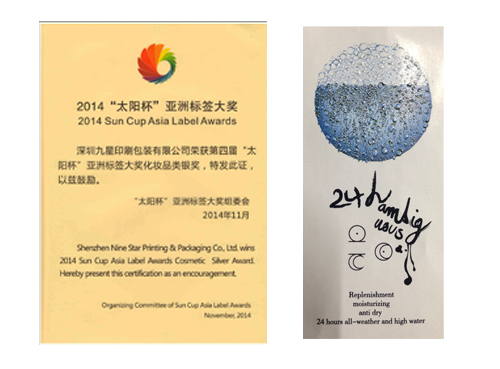標(biāo)簽行業(yè)極具影響力的2014“太陽(yáng)杯”亞洲標(biāo)簽大獎(jiǎng)?lì)C獎(jiǎng)盛典,近日在上海舉行。九星印刷選送作品“NS 24小時(shí)高效補(bǔ)水面霜標(biāo)簽”榮獲化妝品類銀獎(jiǎng)。