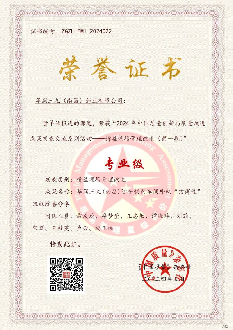 華潤三九(南昌)綜合制劑車間外包“信得過”班組榮獲中國質(zhì)量協(xié)會(huì)“專業(yè)級”榮譽(yù)
