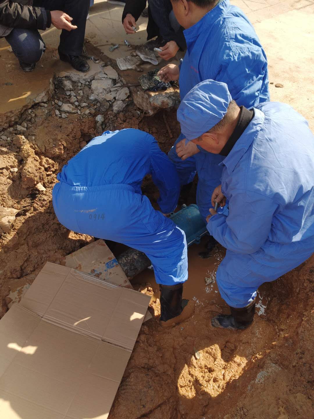 8點30分,挖掘機挖開混凝土,斷成兩部分的主水管暴露出來。搶修小組快速設(shè)置安全圍欄后并進行搶修。關(guān)掉主閥后消防水管的水往主管道回流,導(dǎo)致破裂水管持續(xù)噴水,搶修工作變得極為困難。但搶修人員不懼嚴寒搶時間趕進度,利用抽水泵以最快的速度把哈夫節(jié)安裝好。經(jīng)過挖坑、排漬水、清淤、補漏、回填等搶修工作,下午一點經(jīng)水壓調(diào)試及時恢復(fù)了全公司供水,未影響正常生產(chǎn)運行。