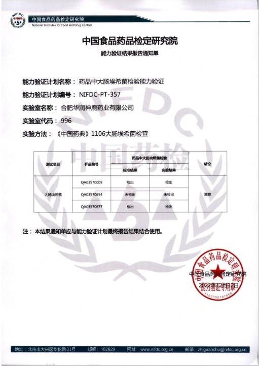 近日,在中國食品藥品檢定研究院公布的2023年的能力驗證計劃報告中,華潤神鹿檢驗中心參加的“藥品中霉菌和酵母菌總數(shù)計數(shù)能力驗證(NIFDC-PT-446)”及“藥品的比旋度測定能力驗證(NIFDC-PT-406)”分別榮獲滿意證書。大連中食國實檢測技術(shù)有限公司公布的2023年的能力驗證計劃報告中,華潤神鹿檢驗中心參加的“中藥材中水分和總灰分的測定能力驗證(CFAJPA-2296)”同樣榮獲滿意證書。上述四項滿意證書的獲得,標(biāo)志著2023年華潤神鹿檢驗中心參加上述能力驗證項目全部通過,并連續(xù)5年通過能力驗證。
